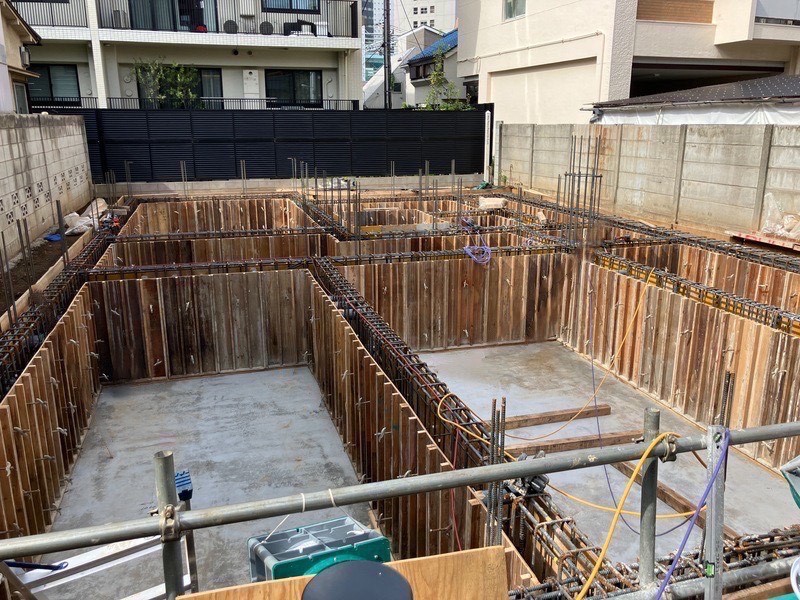 基礎型枠建て込み中ですが、その名の通り建物を支える基礎部分。