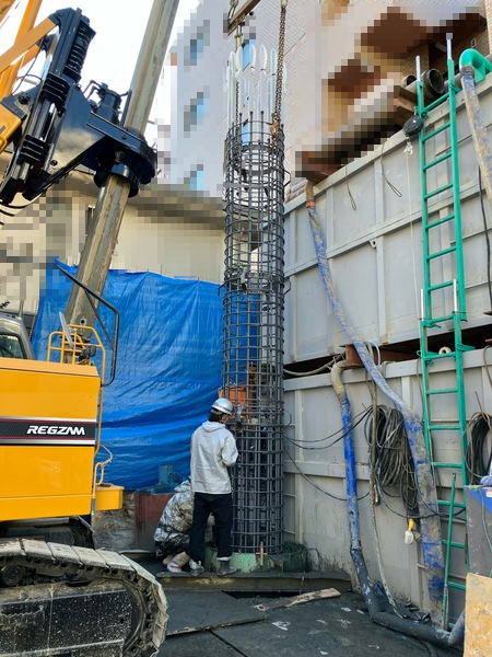 アースドリル掘削機にて地盤を掘削し、その孔の中に円筒状の鉄筋かごを挿入し、