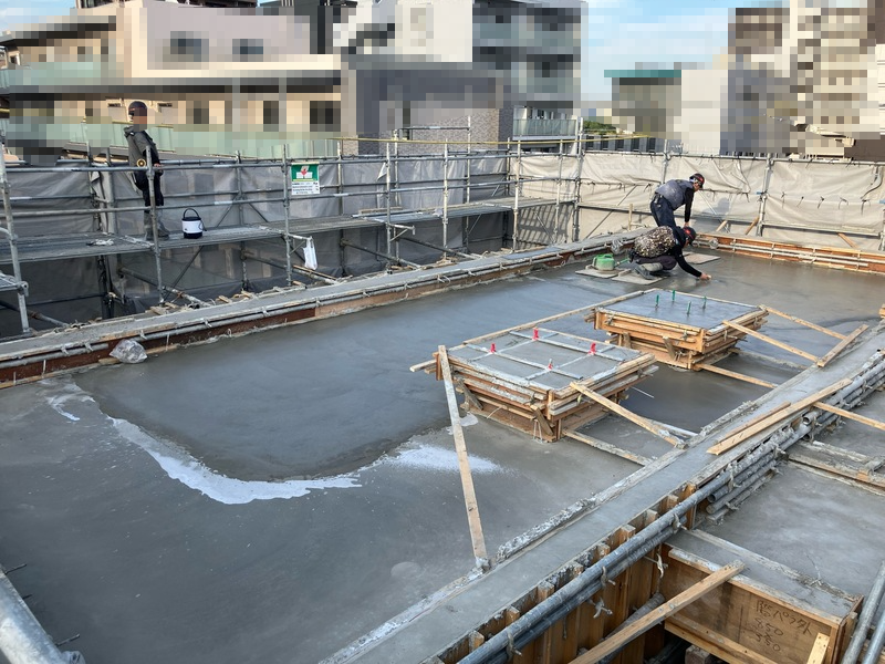 昨日、屋上の生コンクリート打設が完了しました。