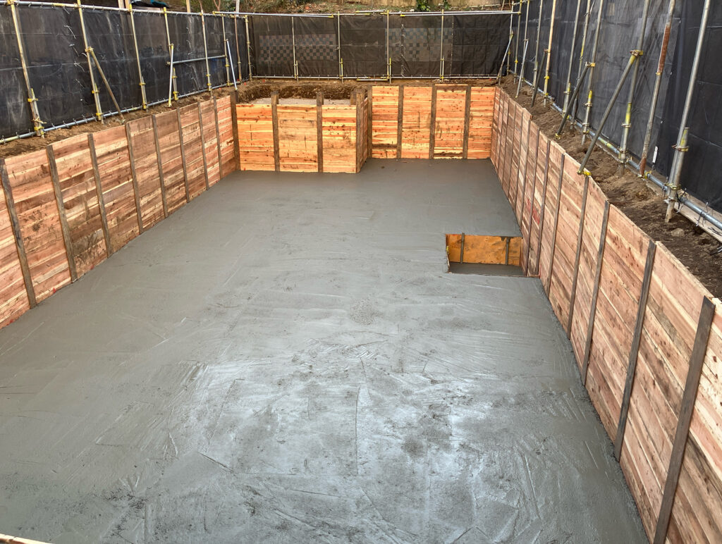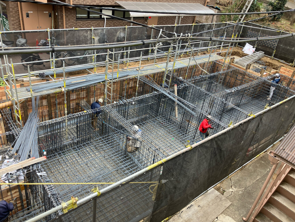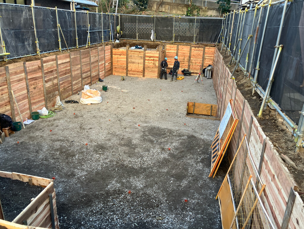 山留工事 掘削工事 捨てコン 基礎鉄筋工事 耐圧コン DATE 工事期間:2025年12月~2026年6月 工事内容:マンション建設工事 構造:RC造5階建 延床面積:472.15㎡ 建築面積:117.90㎡